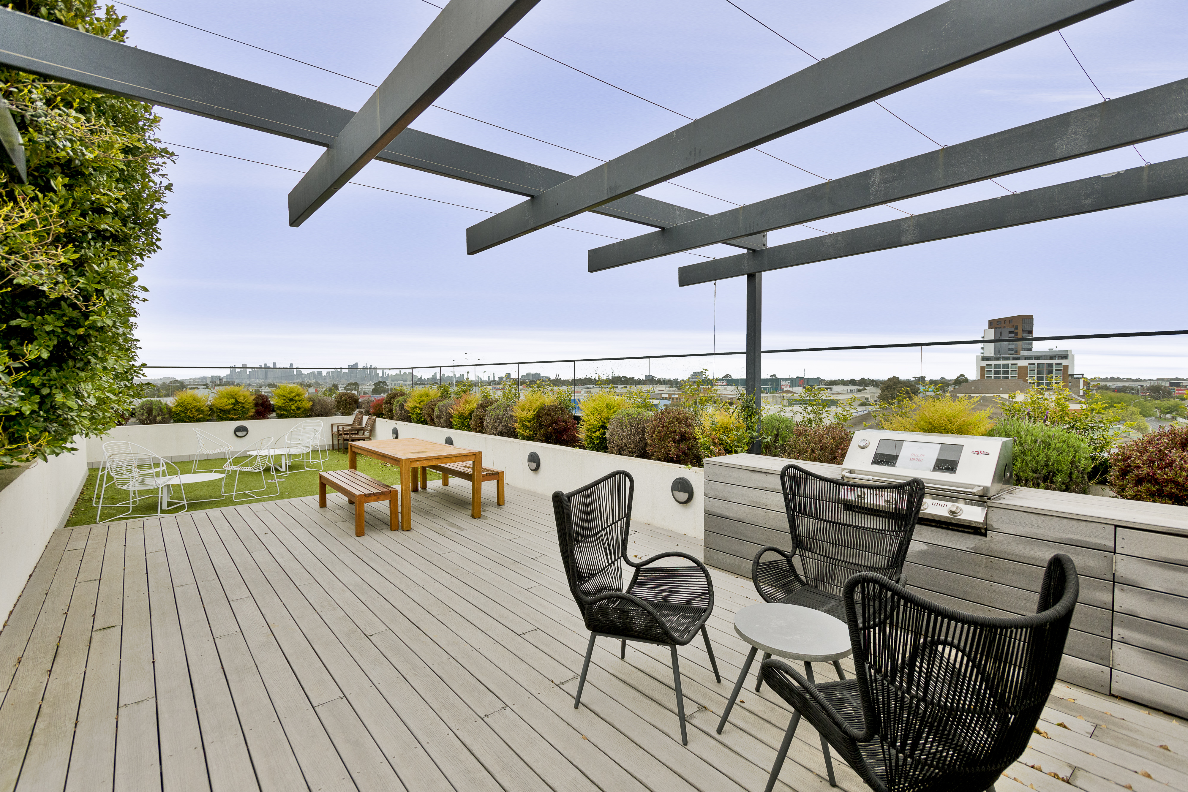 • Large master bedroom has an ensuite bathroom with frame-less glass shower, full-height tiling and abundant storage in bathroom, kitchen and bedroom spaces • Double sized showers with Rainfall shower fixtures • Each bedroom has fully-fitted robes with ample hanging space along with shoe and slack racks • Study area has a built in desk and skylight • 2 oversized garaged parking lots and 2 lockable garage storage units. Located within kilometers to Melbourne CBD, stones throw from Highpoint Shopping Centre, public transport, park-lands, schools and aquatic center. • Top floor where a rooftop entertainment terrace including built in BBQ plus an indoor entertainment is for all residents to enjoy. • close to tram line #82 to Footscray and Moonee Ponds as well as the 57 to the City